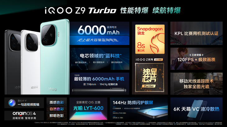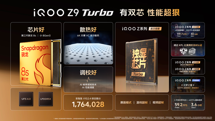 iQOO Z9 Turbo与竞品相比的优势在于配备了一个独立的显示芯片,同时搭载骁龙8S Gen3,支持游戏超帧,配合UFS 4.0的内存以及LPDDR5X的闪存,并搭载全新内存融合4.0技术,让iQOO Z9 Turbo在性能方面也不用担心。