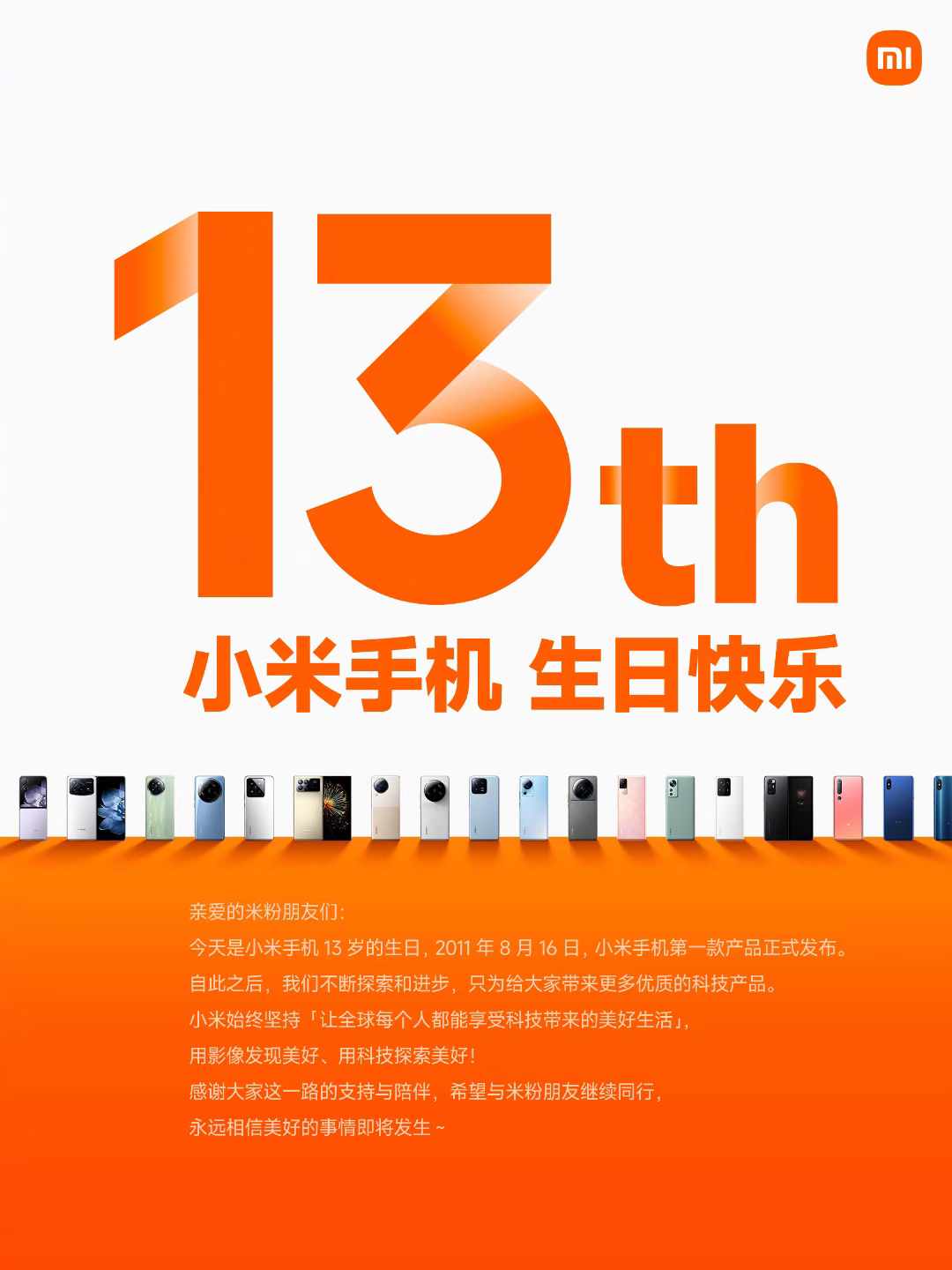 今天是小米手机13岁生日,2011年8月16日小米手机第一款产品正式发布。
