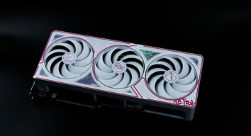 显卡背板也采用白色涂装,同时采用金属材质,粉色的“Ultra”涂鸦字体几乎覆盖了整个背板,在背板上部也做了开孔的镂空处理以增加散热风道,使得散热更强。