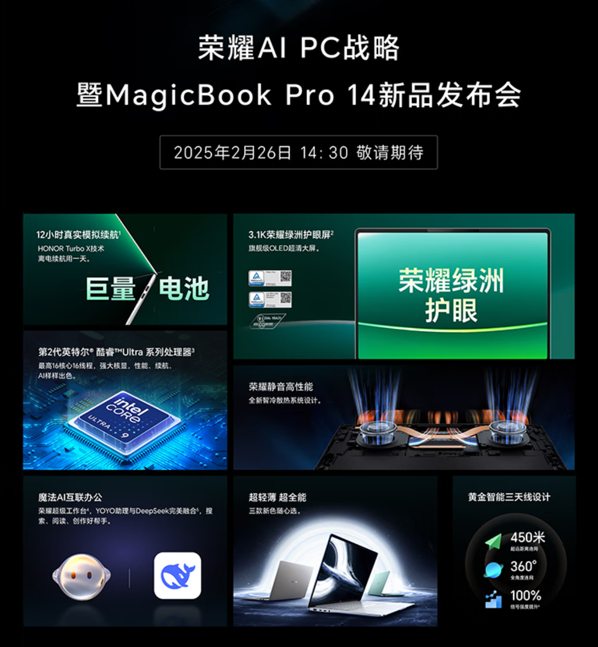 目前,荣耀MagicBook Pro 14已在荣耀商城、各大授权电商及零售门店等渠道开启盲约,感兴趣的用户可以提前预定。2月26日新品发布会在即,期待共同见证荣耀笔记本的又一里程碑时刻。