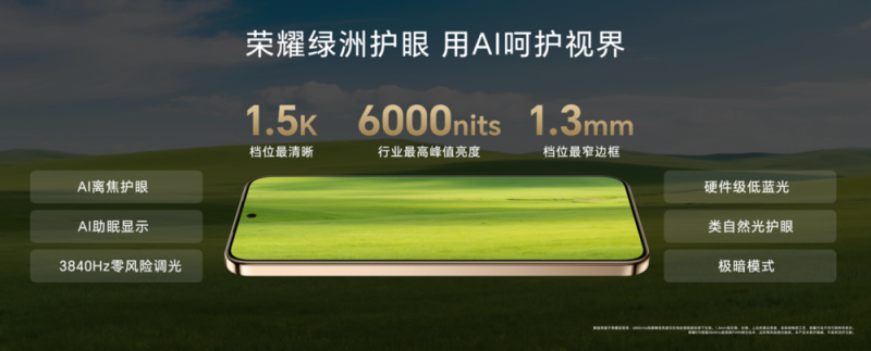 此外,荣耀X70带来更多旗舰级越级体验和人文关怀,其搭载的旗舰级6.79英寸荣耀绿洲护眼屏,峰值亮度高达6000nit,支持3840Hz高频PWM零风险调光、AI离焦护眼、AI助眠显示等六大护眼技术,画质表现更真实,视觉观感更舒适。屏幕更采用新型“氘”代高能效有机发光材料,有效延缓屏幕老化,延长屏幕健康寿命。