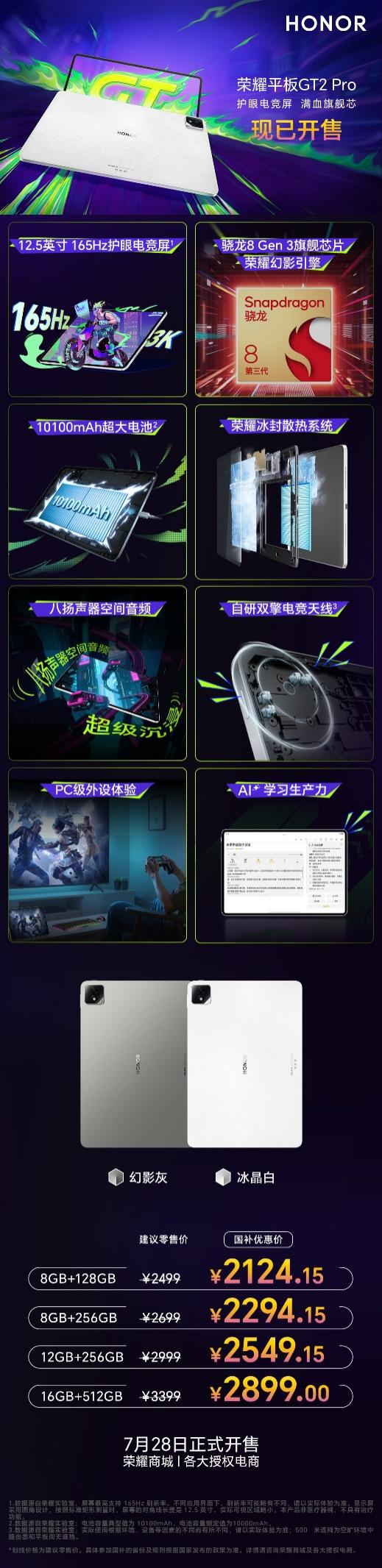 7月28日上午10:08,荣耀平板GT2 Pro正式开启全渠道首销,国补优惠价2124.15元起,购买即享限时赠送荣耀Magic-Pencil 3手写笔优惠。这款定位两千元档的电竞性能旗舰,凭借其12.5英寸165Hz护眼电竞大屏、满血版旗舰芯、以及突破性的游戏帧率适配能力,带来超越价位的标杆级体验。