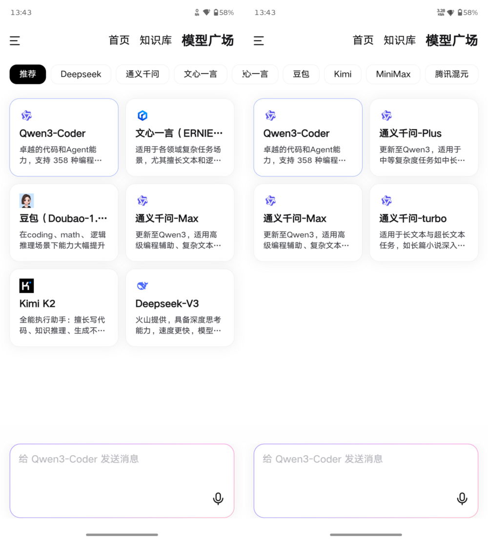 模型广场中提供了Deepseek、豆包、Kimi等20余种模型可选,用户可根据需求选择适配工具,进一步拓展了AI功能的边界。