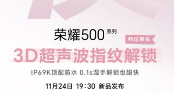 今日,荣耀宣布,荣耀500 Pro将搭载3D超声波指纹,号称“湿手解锁仅需0.1秒”,大幅提升日常解锁体验。