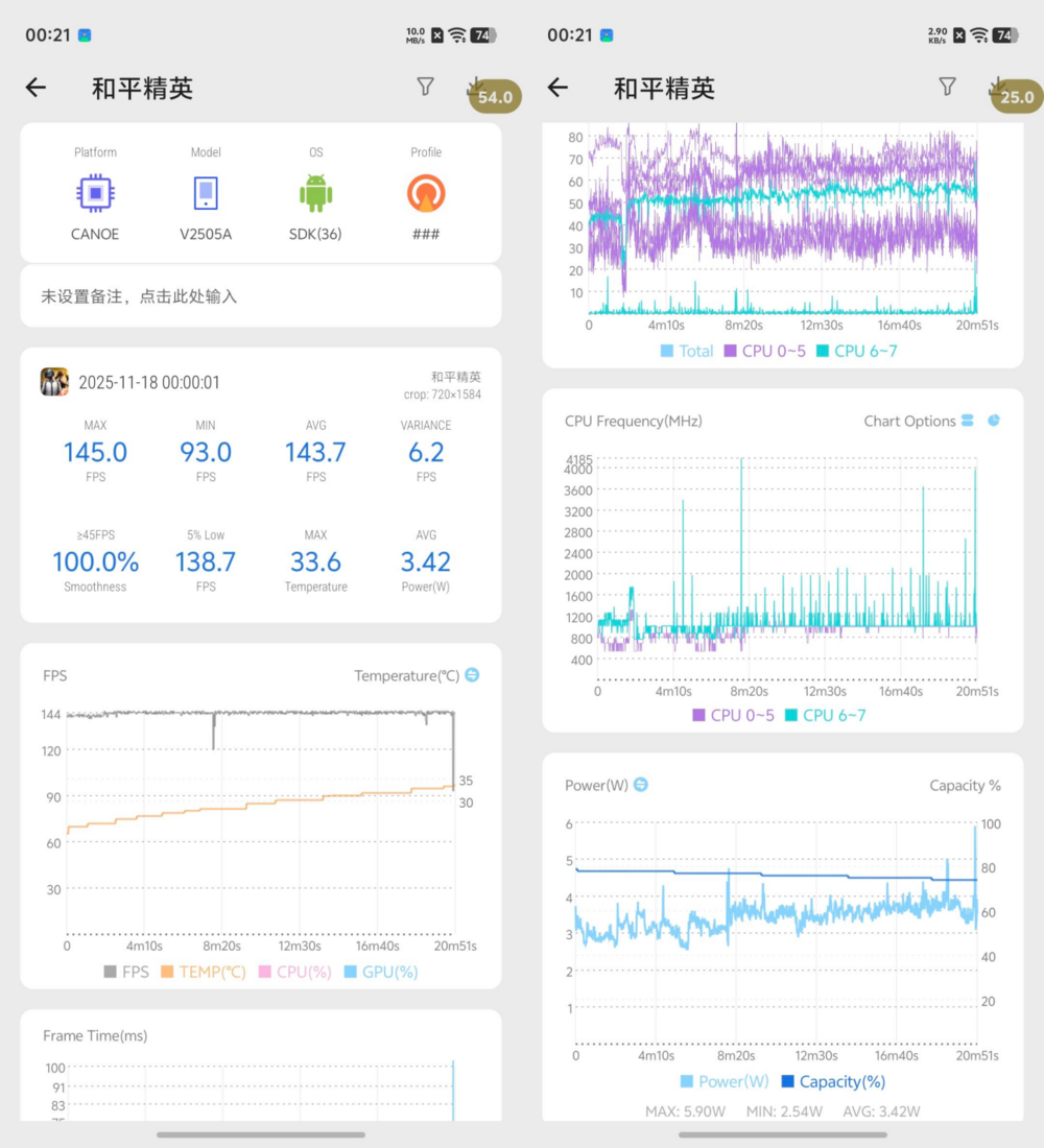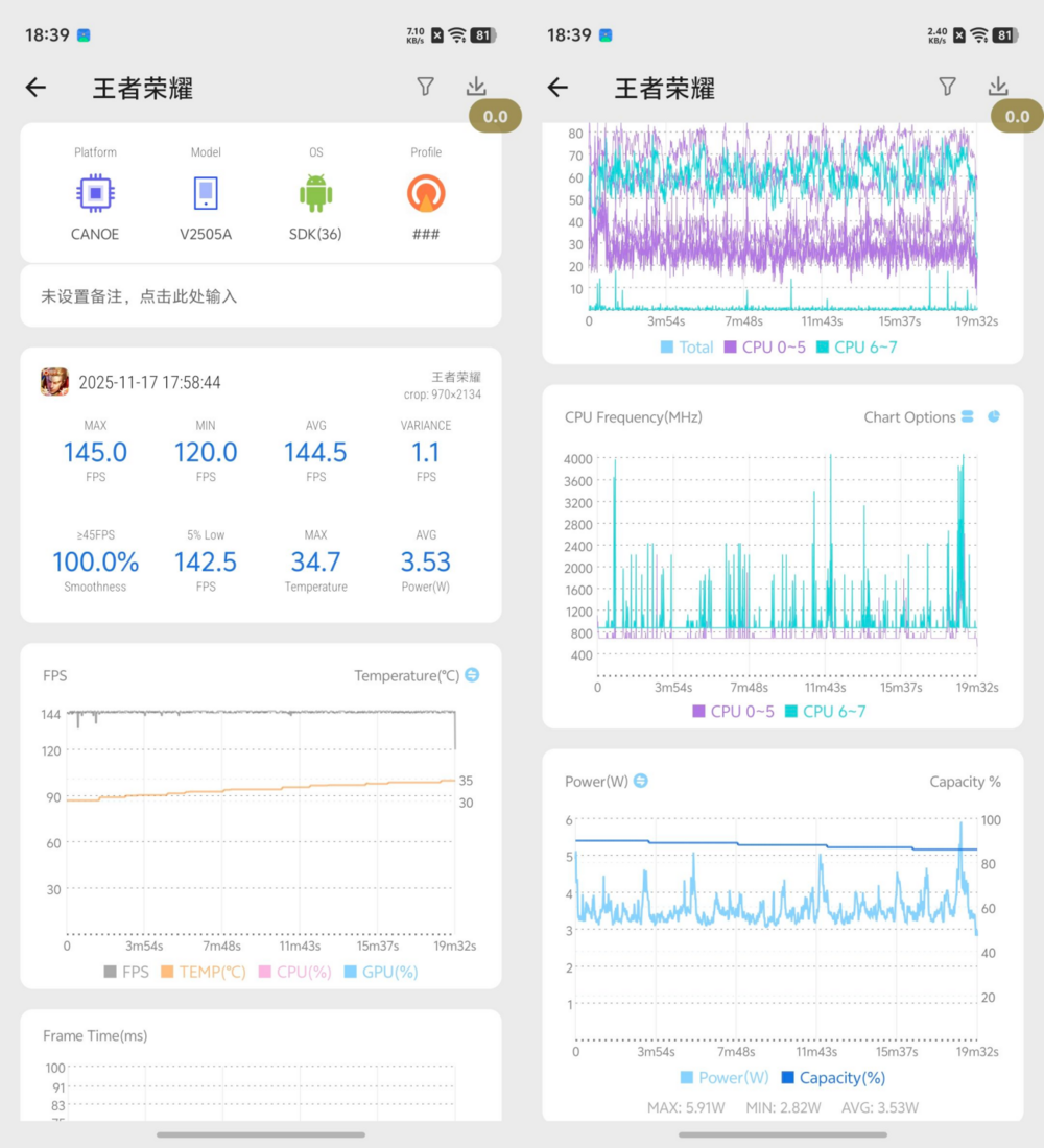 实测《王者荣耀》支持最大145fps。5%low帧为142.5fps,温度仅为34.7℃。