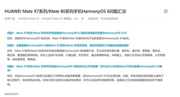 华为官网发布HUAWEI Mate X7系列/Mate 80系列手机HarmonyOS 6问题汇总,对华为Mate 80系列、Mate X7系列系统不能变更作出回应。