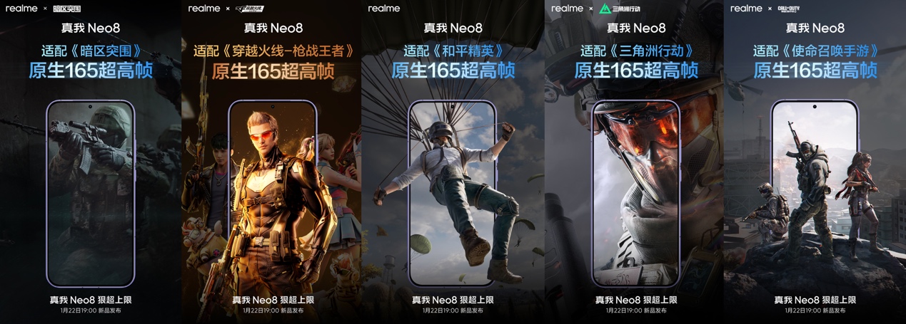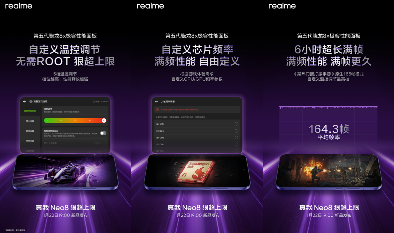 2026年1月16日—中国 · 深圳— 真我Neo8性能配置正式揭晓,将于1月22日19:00开启产品发布会。真我Neo8全面构建三层性能金字塔:第五代骁龙8旗舰芯提供核心性能释放,GT性能引擎实现智能调度优化,行业唯一极客性能面板带来高阶自定义,三层协同狠超性能上限,开启高阶性能时代。搭配全球首发165Hz三星苍穹屏,全面打造"165Hz潮玩电竞旗舰"。