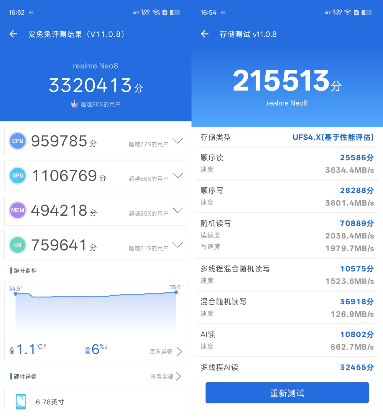 真我Neo8搭载第五代骁龙8旗舰芯,采用与第五代骁龙8至尊版同款的台积电3nm制程和全大核架构(2×3.8GHz + 6×3.32GHz),配合LPDDR5X内存与UFS 4.1闪存,构成了同档顶级的性能铁三角。安兔兔跑分达到332万,理论性能足以应对各类重度应用和大型游戏。