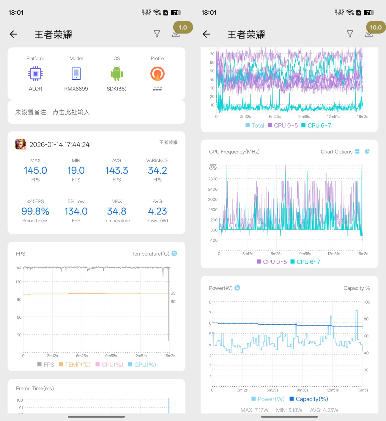 在王者荣耀的表现上,平均帧率为143.3fps,5%low帧为134fps,整体平均功耗为4.23W,整体体验十分流畅。