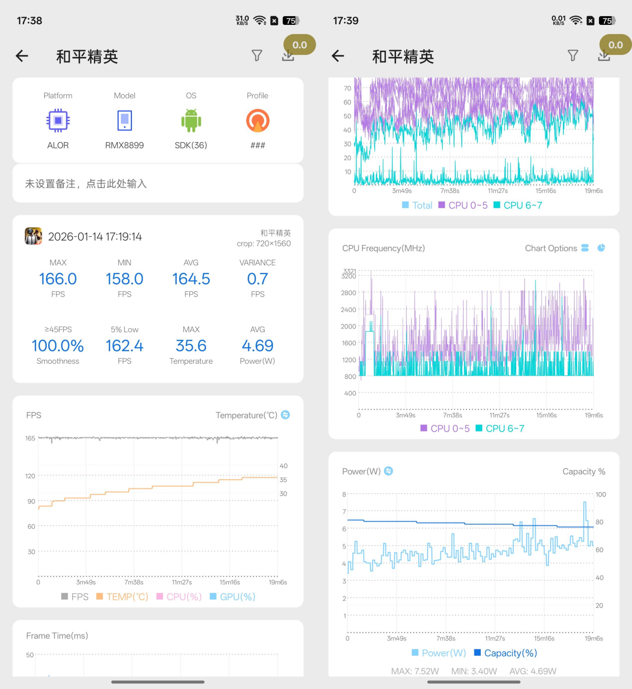 和平精英中由于适配了165帧模式,5%low帧为162.4fps,平均功耗4.69W,整体体验也是非常流畅。