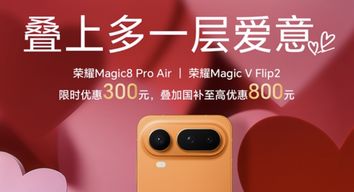 荣耀官方开启限时促销活动,荣耀Magic8 Pro Air、荣耀Magic V Flip2迎来直降300元优惠,叠加国家补贴后最高可省800元,活动时间截至2月14日。