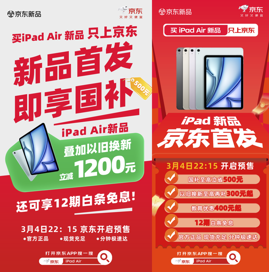 同步亮相的2026款iPad Air,成为苹果平板产品线的又一生产力利器。新款iPad Air直接搭载了强大的M4芯片,兼容妙控键盘与Apple Pencil Pro,轻松兼顾专业创作与移动办公需求。2026款iPad Air起售价4799元,京东同步推出12期免息,国家补贴立减15%,以旧换新补贴300元,学生群体还可叠加教育优惠400元起,至高可享1200元补贴,生产力工具焕新更划算。