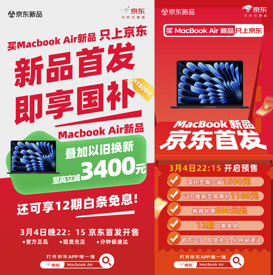作为轻薄本市场的标杆机型,2026新款MacBook Air在性能与配置上迎来重磅升级。搭载了M5芯片,起步存储容量直接翻倍至 512GB,满足用户更大的存储需求。在京东购买新款MacBook Air,可享国补15%至高1500元、教育优惠800元起、以旧换新补贴至高1100元,多重福利叠加至高立减3400元,并享12期免息,轻薄本焕新性价比拉满。