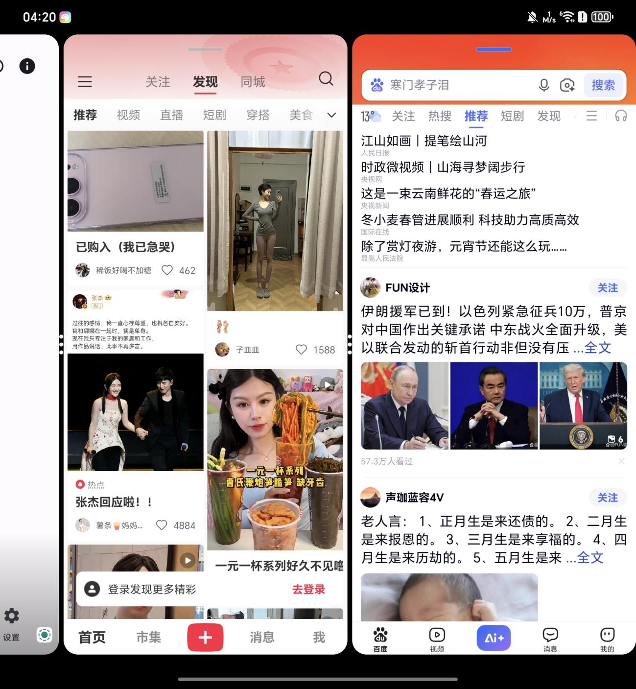 PC级超流畅三分屏是核心亮点之一。它并非简单的应用同屏,而是通过全栈Vulkan图形引擎与多任务统一渲染技术,将多个窗口的渲染任务统一打包处理,从底层减少性能开销。实际体验中,同时打开1GB以上的PPT文件、微信聊天与高德地图导航,三者并行运行依然丝滑流畅,窗口切换、拖拽、缩放毫无卡顿感。系统还提供快捷布局模板,点击底部dock左侧按钮即可快速创建分屏组合,堆叠态下还能可视化快速切换,真正实现把带鱼屏装进口袋,让出差路上的多任务处理效率翻倍。
