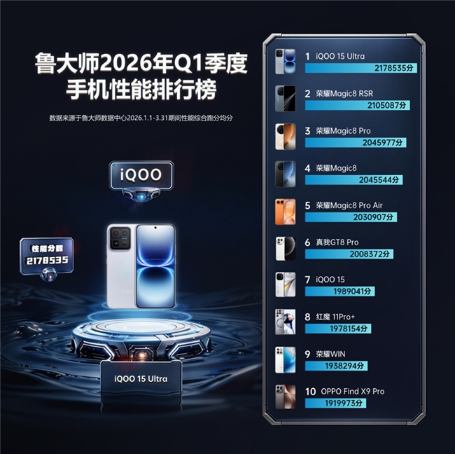 本季度的性能王座由iQOO 15 Ultra以2178535性能分夺得,这不仅是本季度唯一突破215万性能分的机型,也标志着iQOO在顶级性能赛道上实现了历史性突破。