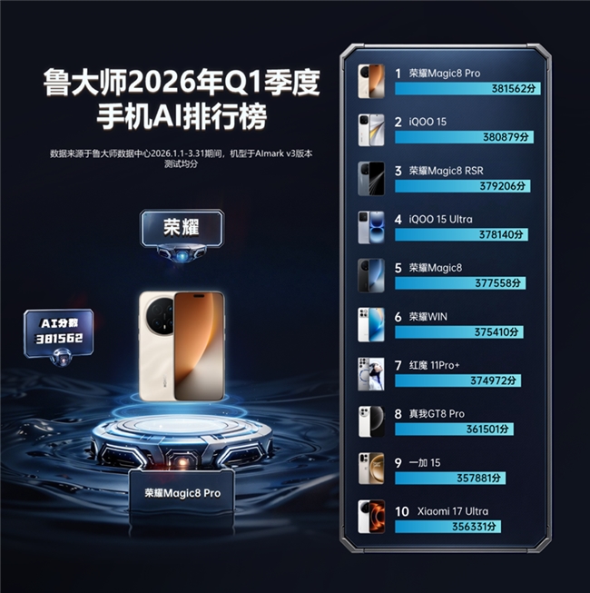 iQOO 15以380879分屈居AI榜亚军,以微弱的差距紧随其后,展现了蓝厂在AI赛道同样深厚的底蕴。荣耀Magic8 RSR则以379206分获得季军,荣耀系机型强势占领第一、第三名,宣告了其在端侧AI算力竞争中的领先地位。