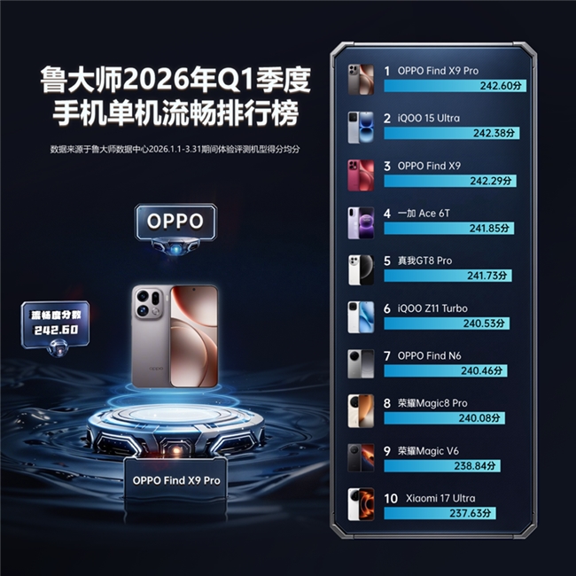 iQOO 15 Ultra以242.38分、OPPO Find X9以242.29分分别获得亚军和季军,前三名分数差距仅在毫厘之间,竞争之激烈前所未有。一加Ace 6T和真我GT8 Pro分别以241.85分和241.73分位列第四、第五,OPPO系机型再次展现了在流畅度调校上的集团优势。