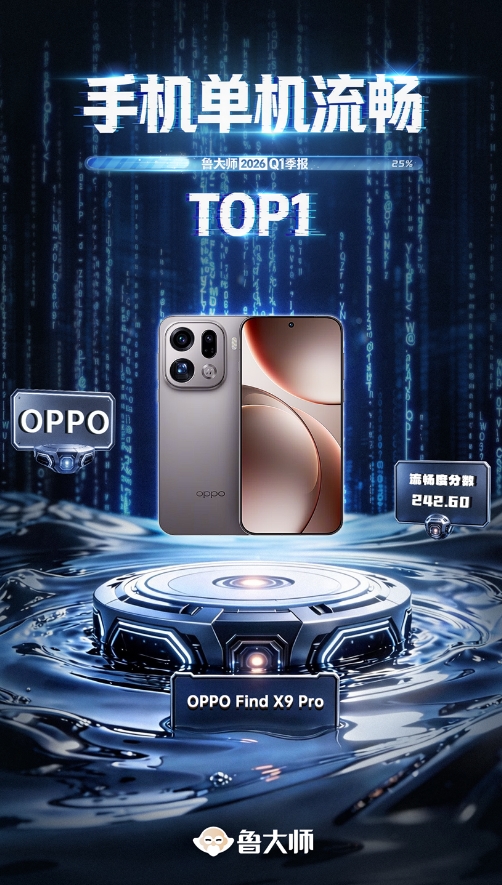 OPPO Find X9 Pro以242.60流畅分的成绩夺得单机流畅第一,展现了OPPO在软硬协同优化上的持续领先实力。