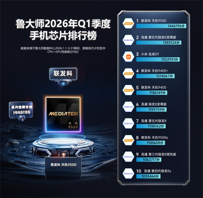 Q1芯片性能榜迎来了历史性时刻,芯片市场的竞争已进入深水区,联发科凭借天玑9500的卓越表现,成功在顶级性能领域反超高通骁龙旗舰芯片,而小米的自研玄戒芯片也已成为一股不可忽视的稳定力量。