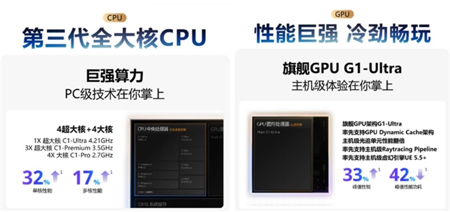 天玑9500也使用台积电第三代3nm制程工艺,尽管保持上代1+3+4全大核,但规格大换血,尤其是频率拉高——超大核升级为C1-Ultra,主频飙到4.21GHz,追上友商节奏;三颗C1-Premium提到3.5GHz,四颗C1-Pro也涨到2.7GHz,而GPU由上代G925升级至G1-Ultra,核心规模12核,频率上涨100MHz多至1716MHz。其GPU部分以845032分的成绩大幅领先第五代骁龙8至尊版,成为制胜关键,这标志着联发科在旗舰芯片的GPU性能上实现了里程碑式的突破。